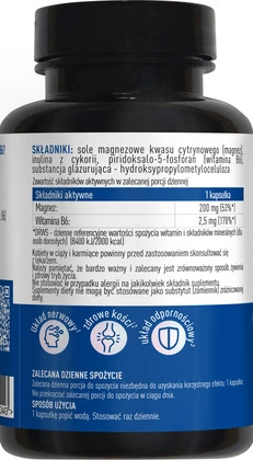 Składniki: Składnik - 1 kapsułka (%RWS) magnez - 200 mg (53%) witamina B6 - 2,5 mg (178%) sole magnezowe kwasu cytrynowego (magnez), inulina z cykorii, piridoksalo-5-fosforan (witamina B6), substancja glazurująca - hydroksypropylometyloceluloza.