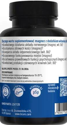 Suplement diety BCure Magnez Forte + Witamina B6 zawiera 200 mg magnezu w jednej kapsułce. Dodatkowo suplement diety zawiera koenzymatyczną witaminę B6 w formie chemicznej pirydoksalo- 5-fosforanu (P-5-P). Dzięki czemu przyczynia się do utrzymania prawidłowego metabolizmu energetycznego organizmu, pomaga w prawidłowym funkcjonowaniu układu nerwowego oraz przyczynia się zmniejszenia uczucia zmęczenia i znużenia.